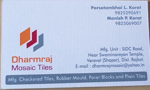 Dharanraj Mosaic Parsotambhai Korat 9825290691 Sidc road near swami narayan tampel Veraval Sapar Dharamrajmosaic@yahoo.in