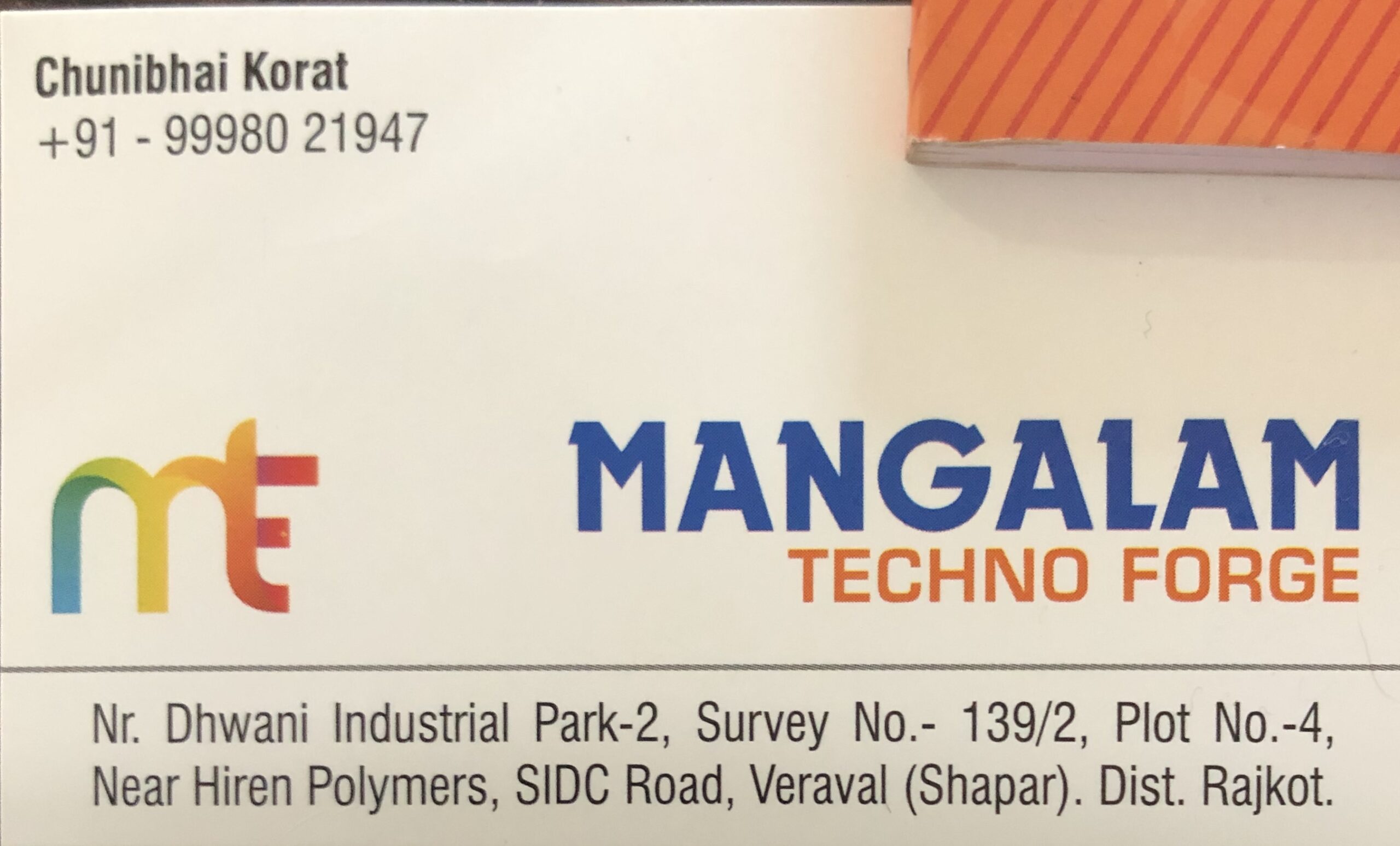Mangalam techno forge Chunibhai Korat 9998021947 Nr.dhwani ind.park -2 survey no 139/2 plot no.-4 near Hiren polymers side road veraval(Shapar)