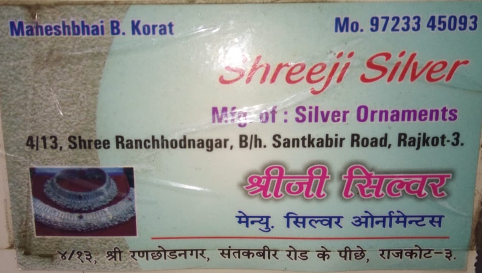 Shreeji silvar Maheshbhai .b .korat 9723345093 4/13 Shree ranchood Nagar B/h Sant Kabir road Rajkot-3