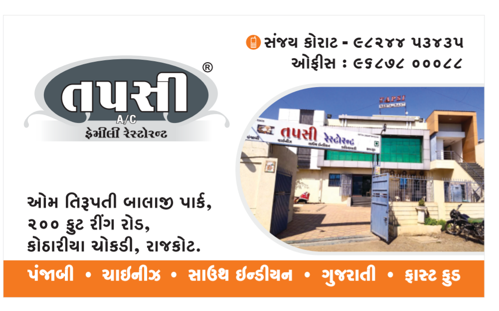 Tapsi Restaurant Sanjabhai Korat 9824453435 Om Tirupati Balaji Park Kothariya chokdi Rajkot