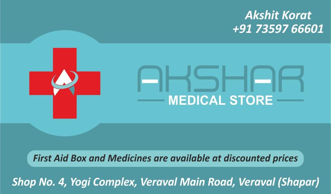 Akshar medical store Akshitbhai Korat 7359766601 veraval main road ,yogi complex ,shop no -4, veraval (shapar)