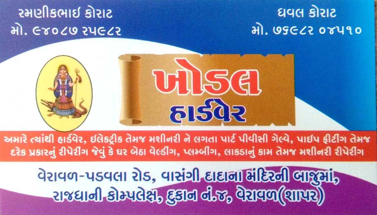 Khodal hardwer Dhavalbhai Korat 7698204510 veraval padwala road near vasangi dada temple veraval (shapar)