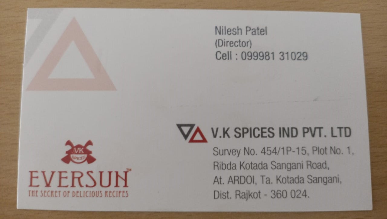 V.K SPICES IND PVT.LTD Nilesh Patel 9998131029 Survey no.454/1p-15 plot no 1 Ribd Kotada Sangani Road At. ARDOI Ta. Kotada Sangani rajkot
