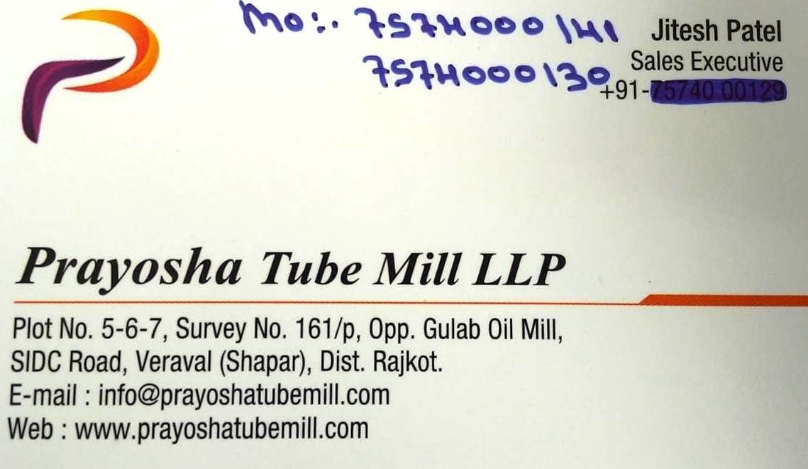 prayosha tube mill LLP Amit Patel 7574000141 plpt no.5-6-7, urvey no.161/p, opp.gulab oil mill, sidc road, veraval (shapar)