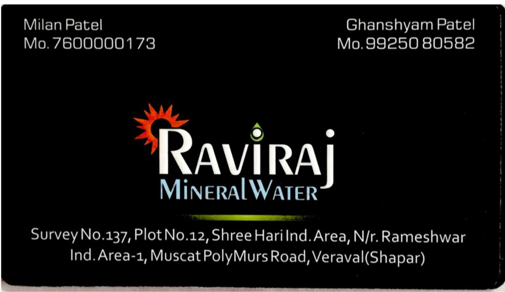 Raviraj Mineral Water Milanbhai Korat 7600000173 Survey no.137, plot no.12, shree hari ind.area,N/r.rameshwar ind.area-1, muscat polymers road,veraval (shapar)