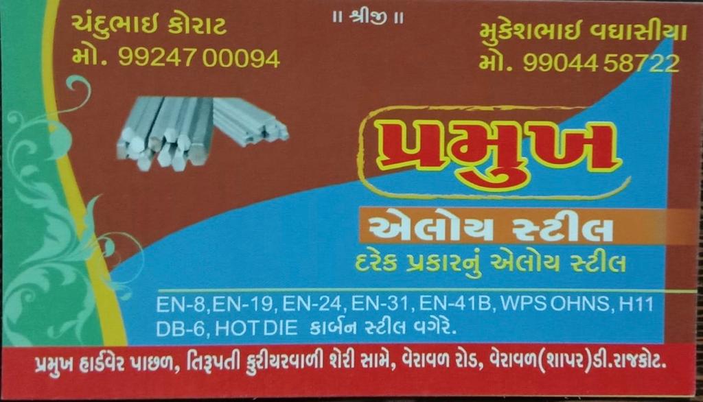 Pramukh alloy steel Chandubhai Korat 9924700094 B/h. pramukh hardware, opp.tirupati courier street,veraval road,veraval (shapar) dist-rajkot.
