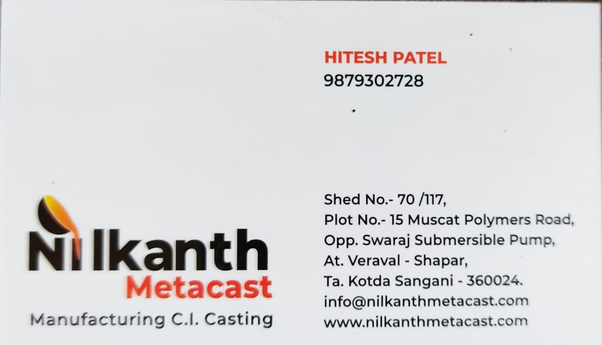 Nilkanth metacast Hiteshbhai Korat 9879302728 Shed no.70/117,plot no.15,muscat polymers road.opp swaraj submersible pump, at.veraval-shapar, info@nilkanthmetacast.com www.nilkanthmetacast.com