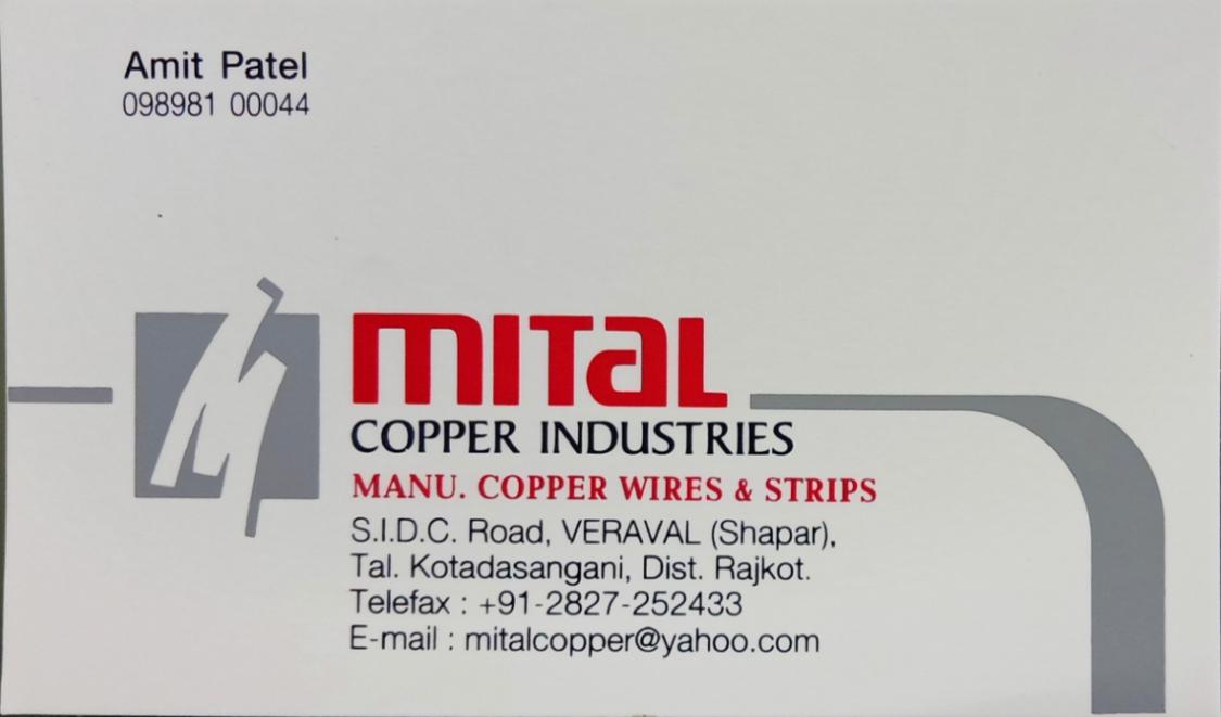 Mital copper industries Amitbhai Korat 9898100044 S.I.D.C.road,veraval (shapar) ta.kotda sangani,dist-rajkot email.mitalcopper@yahoo.com telefax-+91-2827-252433