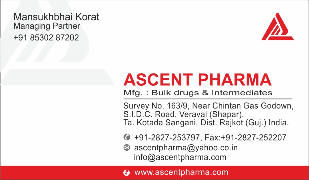Ascent Pharma Mansukhbhai Korat 8530287202 survey no 163/9 near chintan gas godown SIDC rad veraval sapar ascentpharma@yahoo.co.in