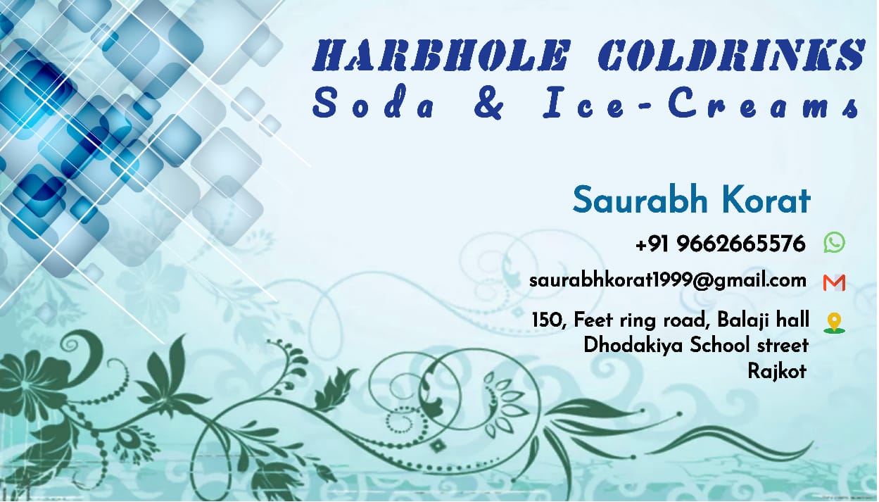 Harbhole Coldrinks Saurabh Korat 9662665576 150, Feet ring road, Balaji Hall, Dhodakiya School Street Rajkot.