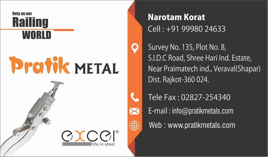 Pratik Metal Narotam Korat 9998024633 survey no 135 plot no 8 SIDC road Shree hari ind.estate veraval sapar